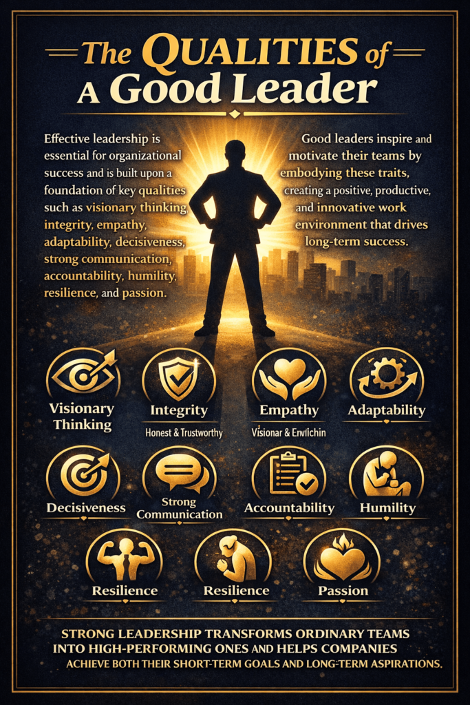 Effective leadership is essential for organizational success and involves key qualities such as visionary thinking, integrity, empathy, adaptability, decisiveness, strong communication, accountability, humility, resilience, and passion. Good leaders inspire and motivate teams by embodyingthese traits, creating a positive, productive, and innovative work environment that drives long-term success.